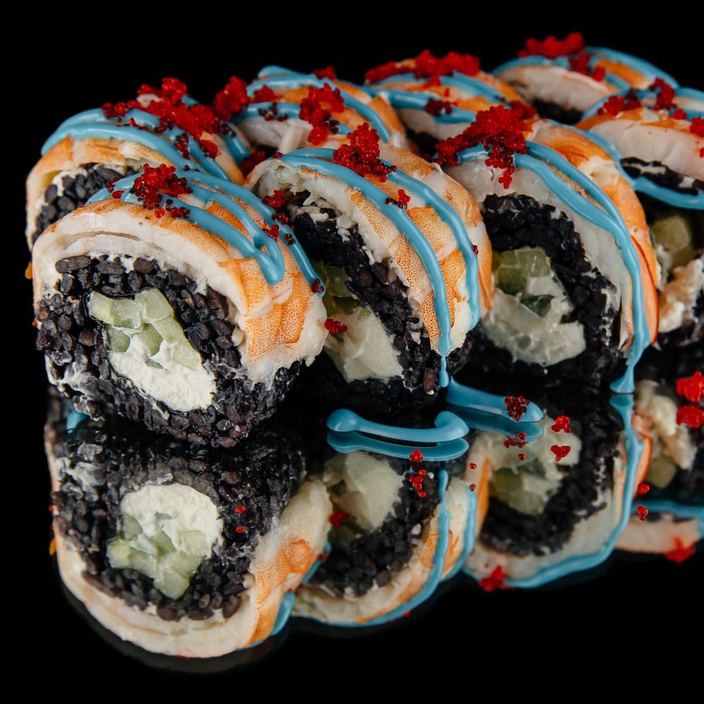 Рис черный, нори, сыр творожный, огурец, креветка отварная, блю, масаго красная