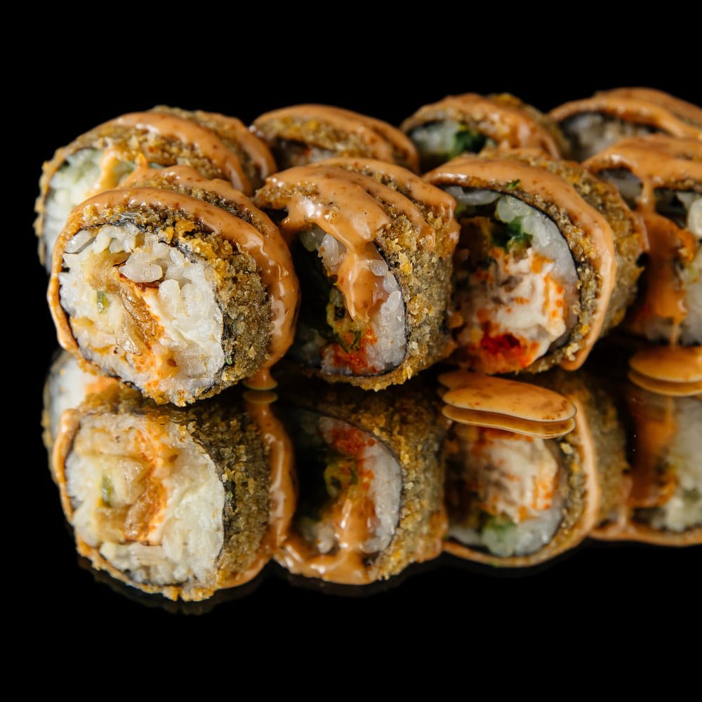 Рис, нори, сыр творожный, водоросли чука, мидии, икра масаго, кларий, соус шичими