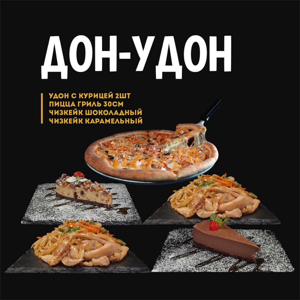 Состав: удон с курицей 2шт, пицца гриль 30см, чизкейк шоколадный, чизкейк карамельный