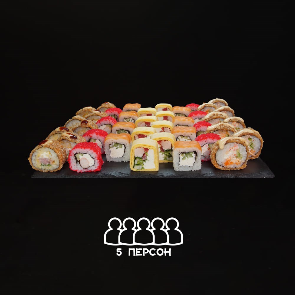 Состав: калифорния темпура, сырный тунец, торнадо с курицей, филадельфия лайт, калифорния с креветкой
