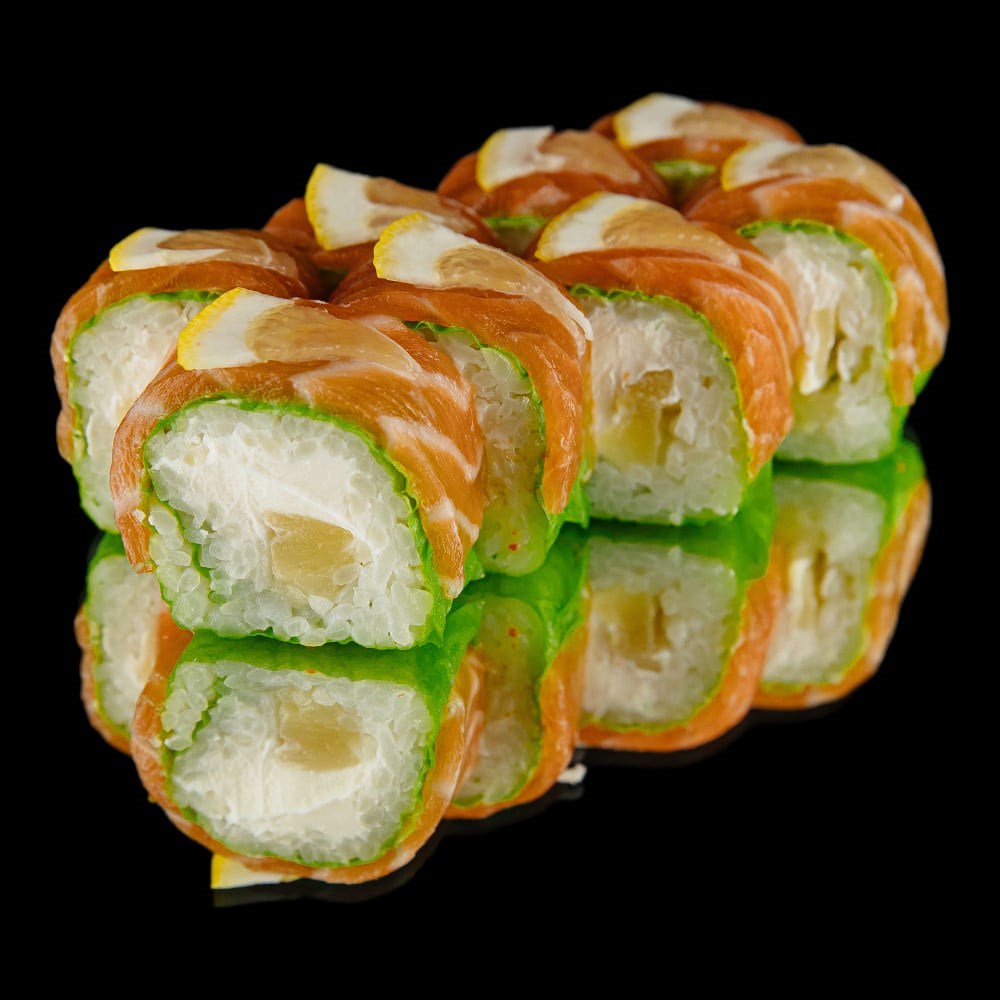 Рис, маменори зеленый, сыр творожный, ананас консревированный, лосось филе, лимон