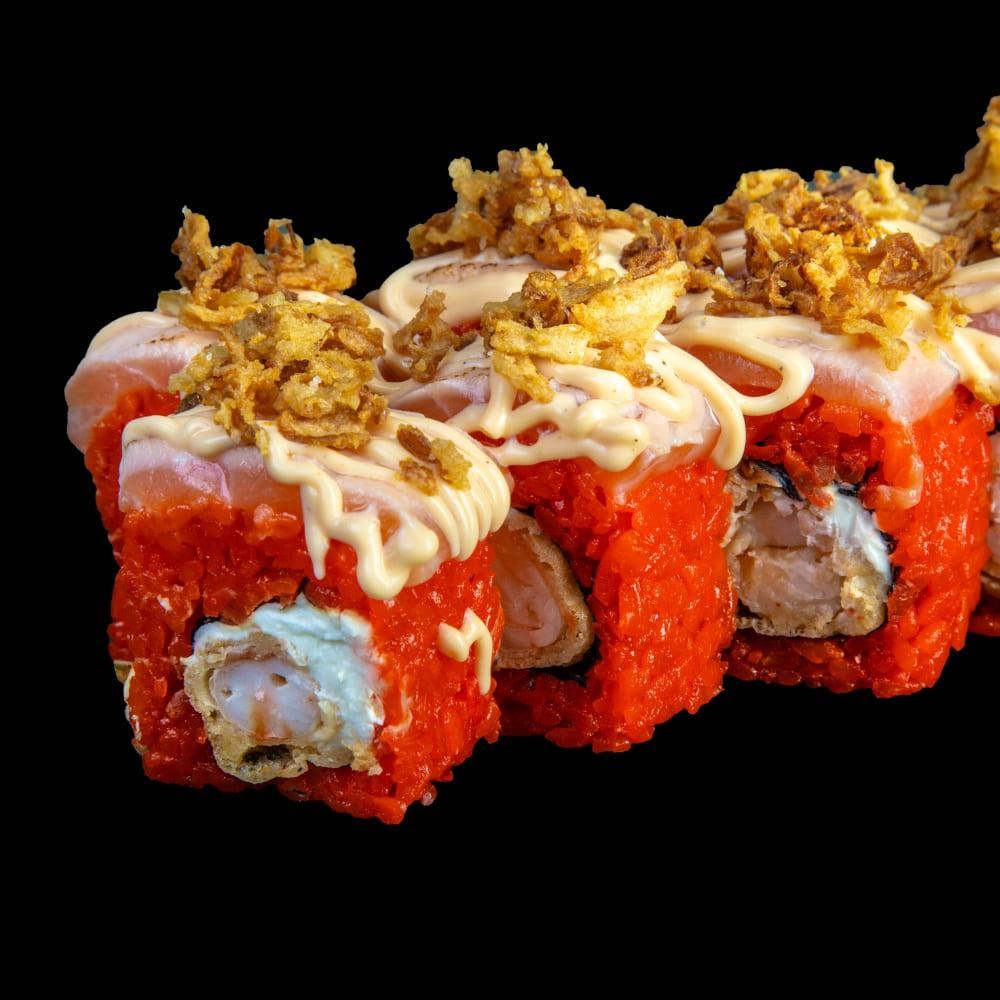 Состав: рис, нори, сыр творожный, креветки, лосось филе, соус гриль, лук жареный