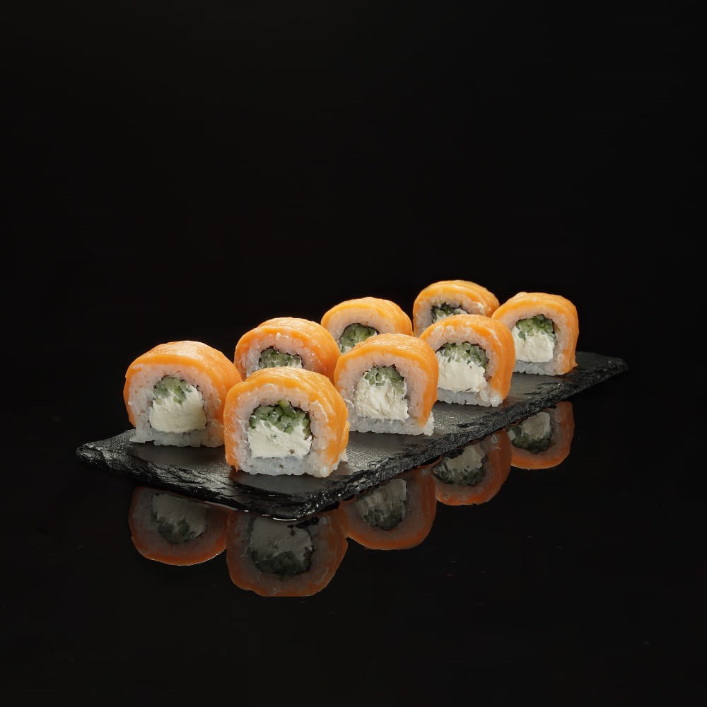 Рис, водоросли нори, сыр творожный, огурец, лосось