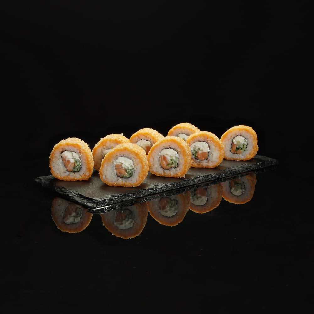 Рис, водоросли нори, сыр творожный, лосось, огурец, кляр, сухари панировочные