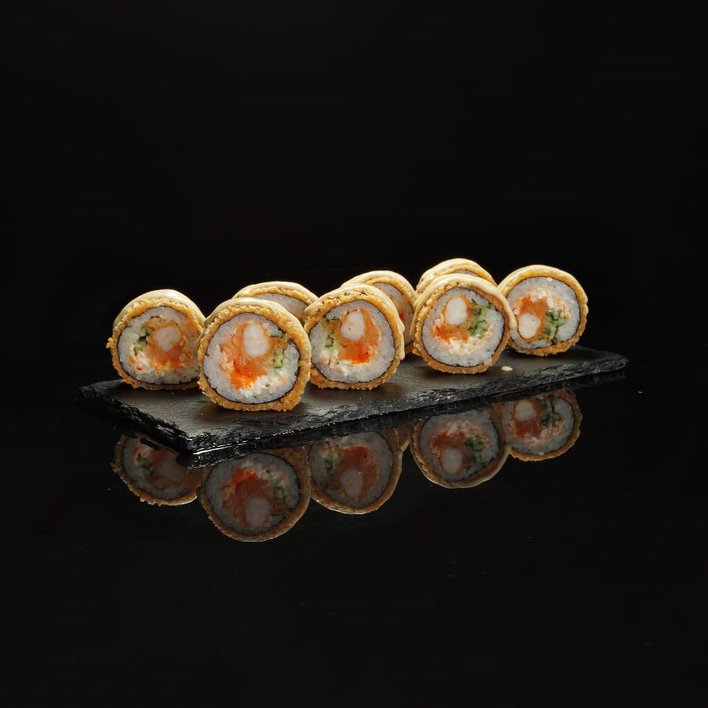 Рис, водоросли нори, сыр творожный, снежный краб, лосось, креветка темпура, огурец, кляр, сухари панировочные, соус тануки