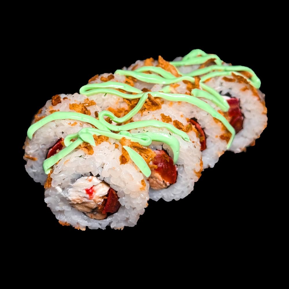Состав: рис для роллов, нори, лосось терияки, сыр творожный, помидор, жареный лук, соус лаймовый