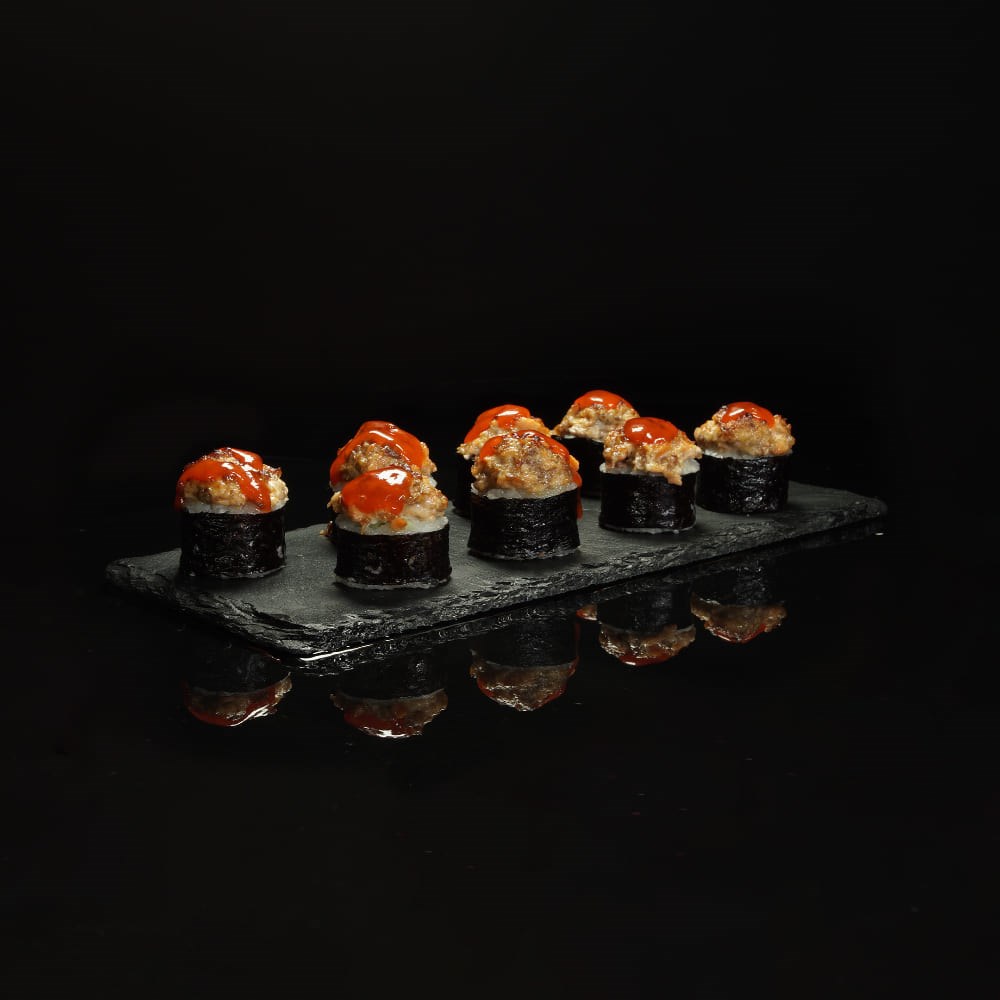 Рис, водоросли нори, сыр творожный, огурец, лосось терияки, майонез, соус шрирача