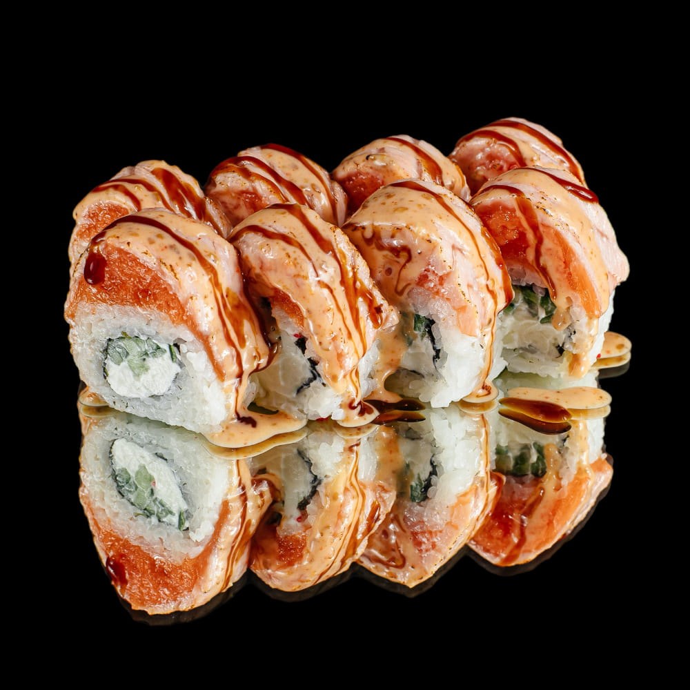 Рис, нори, сыр творожный, огурец, мусс из лосося тар-тар, лосось обожжённый, соус Шичими, соус Унаги