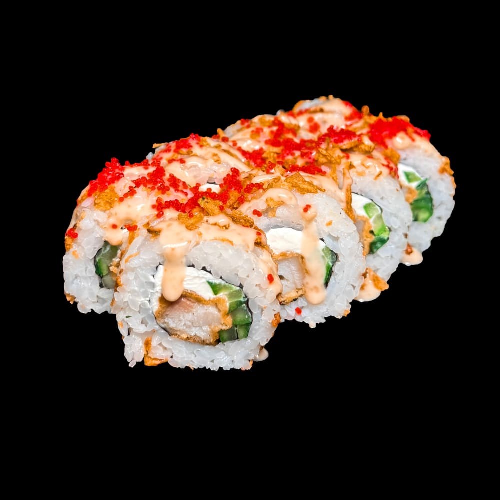 Состав: рис для роллов, нори, окунь в кляре, сыр творожный, огурец, лук жареный, ореховый соус, икра масаго