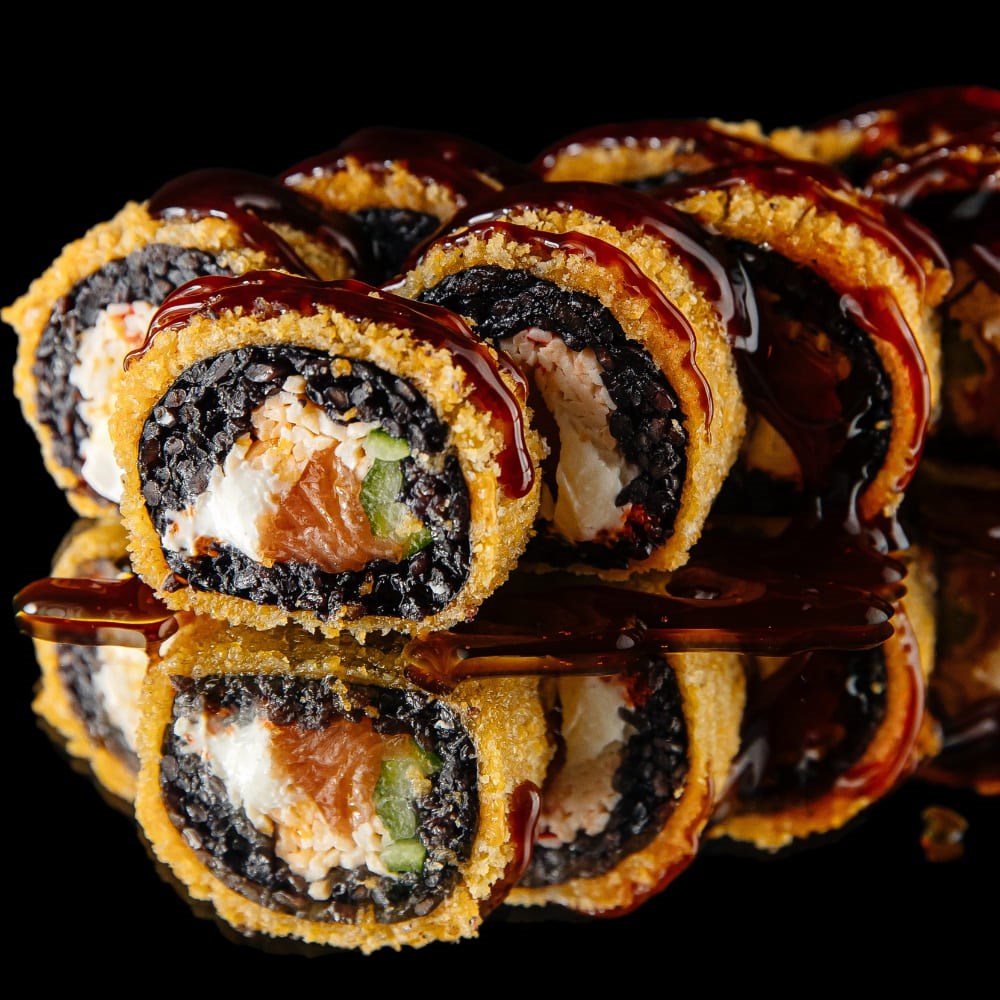 Рис чёрный, нори, сыр творожный, масаго, лосось, краб, огурец, унаги