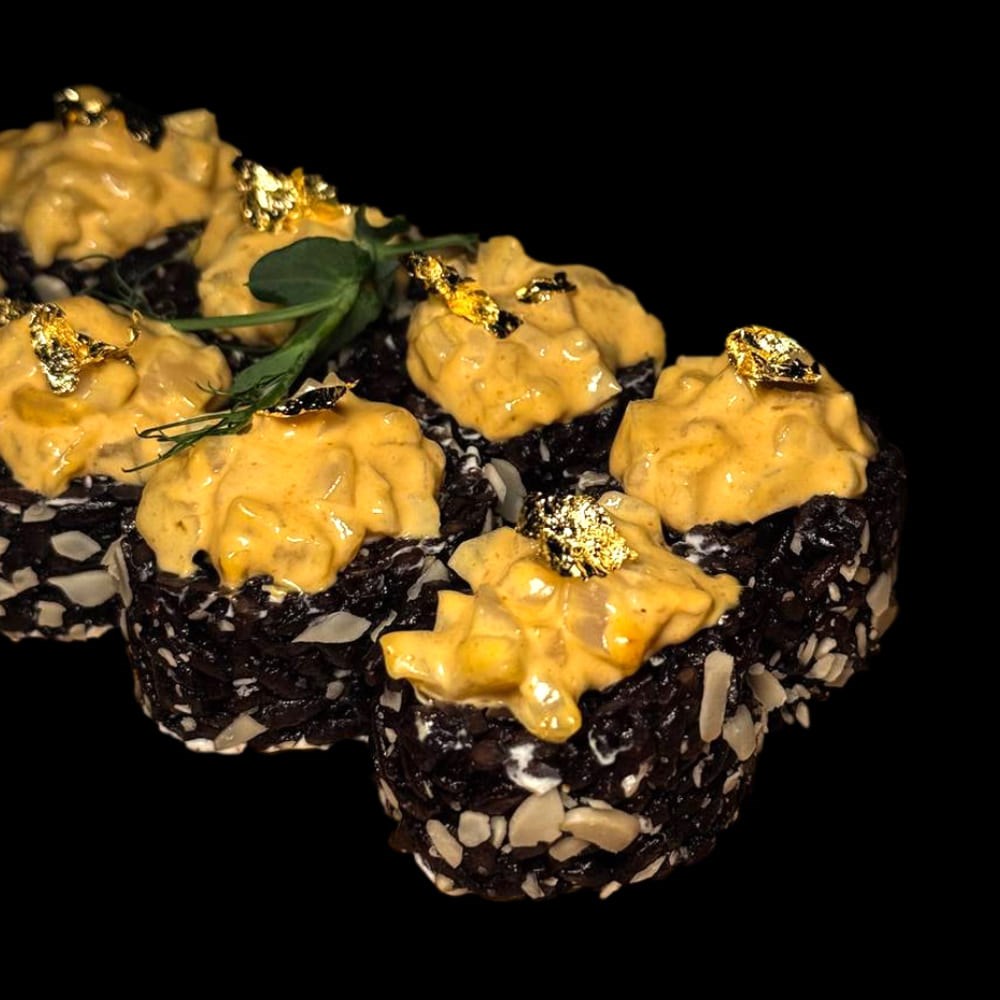 Состав: черный рис, нори, сыр творожный, авокадо, миндальные лепестки, гребешок, соус том ям, бумага золотая (пищевая)