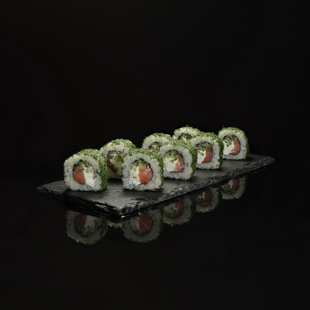 Рис, водоросли нори, сыр творожный, огурец, лосось копченый, укроп