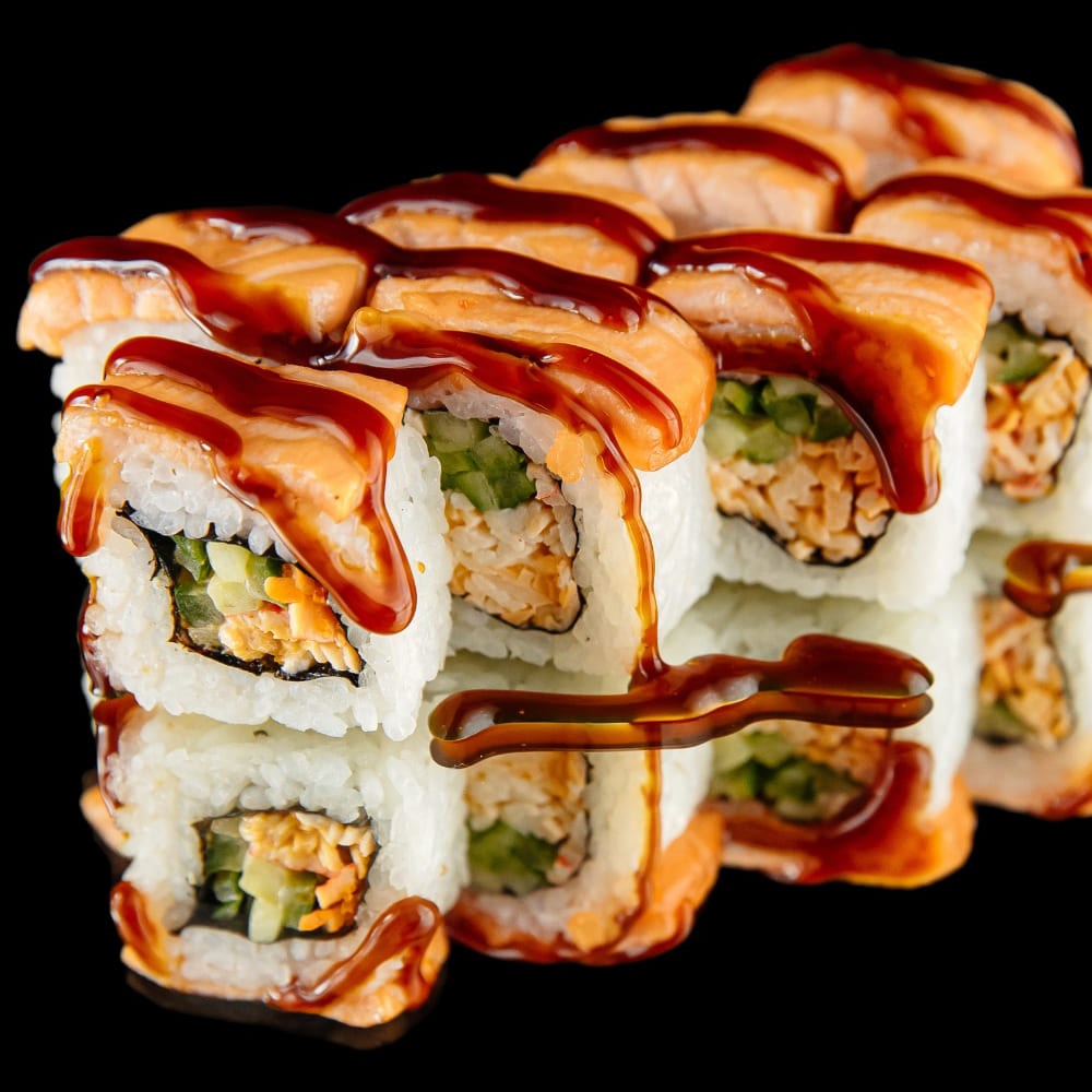 Рис, нори, краб, соус спайси, огурец, лосось лайт, соус унаги