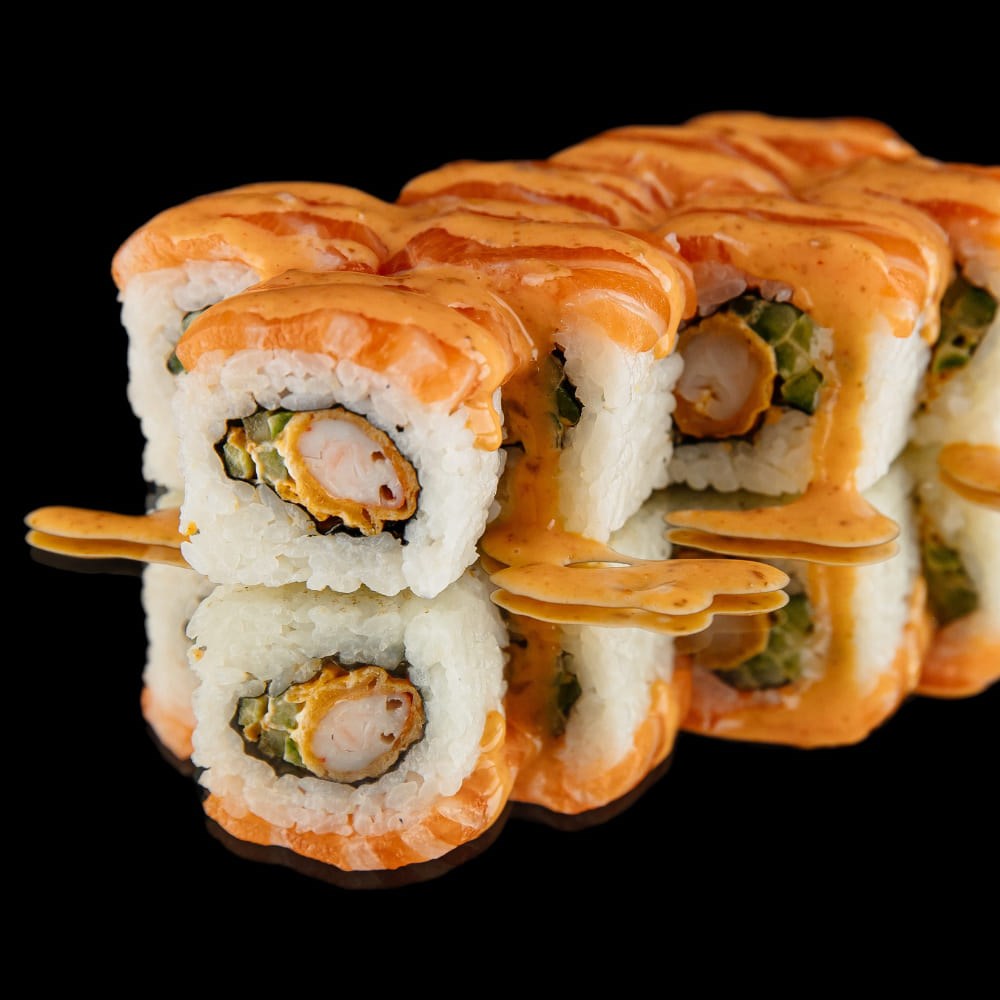 Рис, нори, креветка темпура, соус спайси, огурец, лосось филе, соус шичими, лосось филе