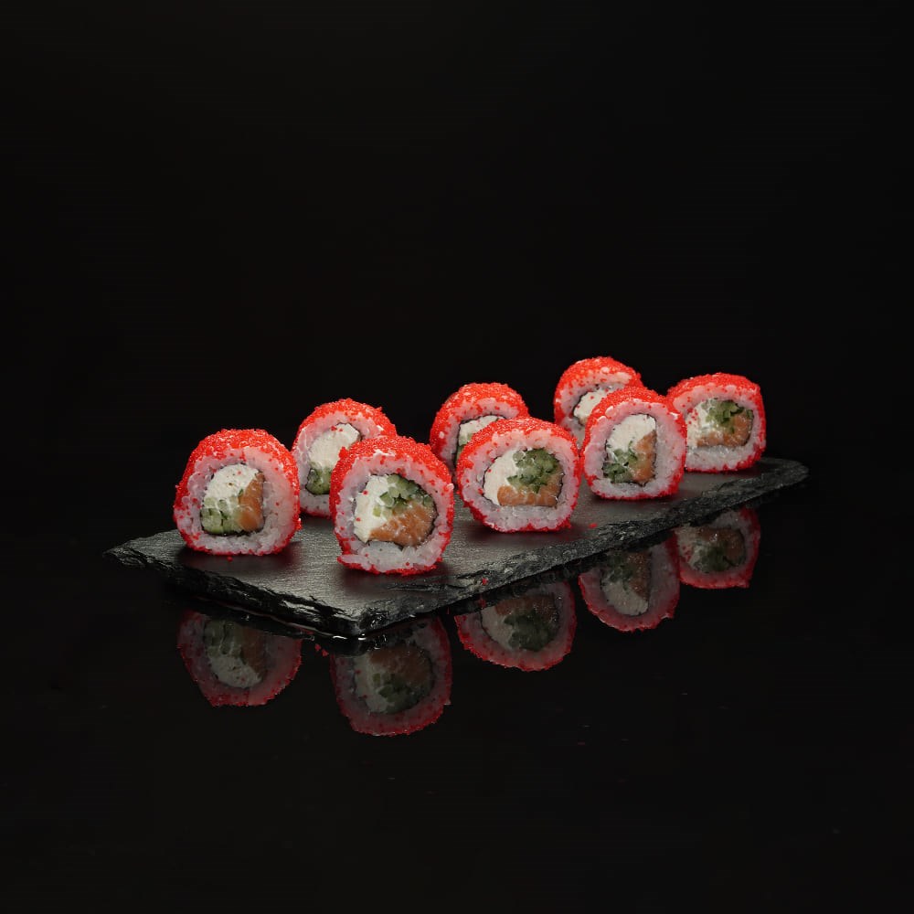 Рис, водоросли нори, сыр творожный, огурец, лосось, икра масаго