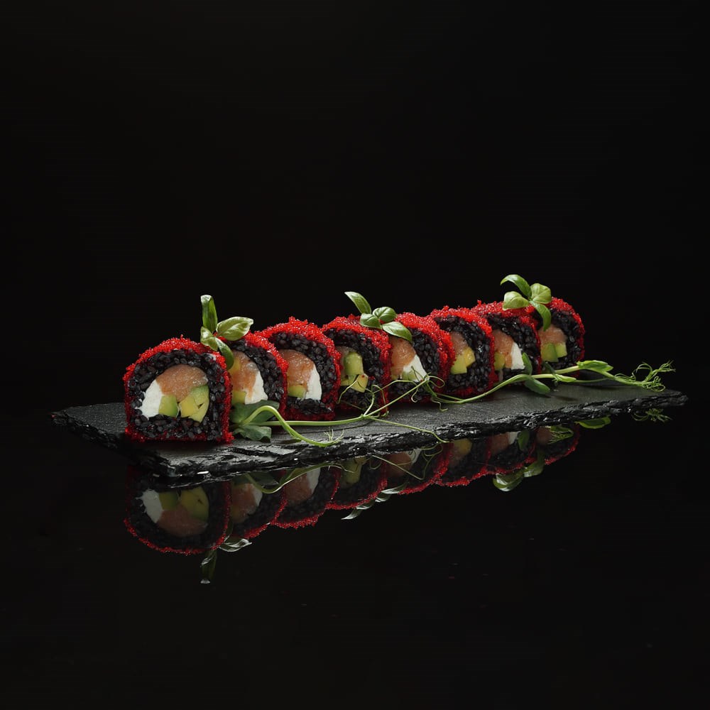 Нори, рис для суши (черный), лосось филе, авокадо, сыр творожный, масаго красная