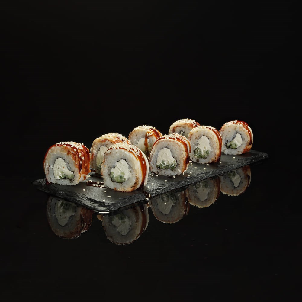 Рис, водоросли нори, сыр творожный, огурец, угорь, соус унаги, кунжут
