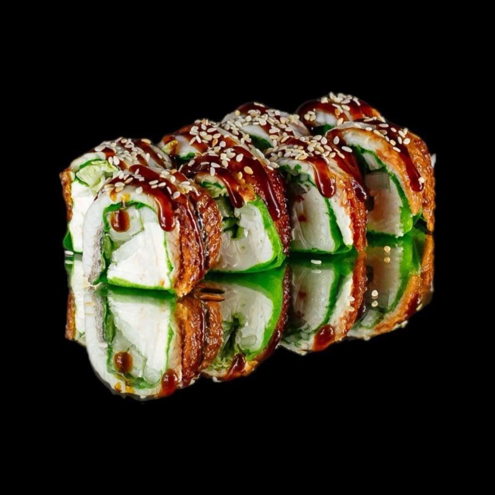 Состав: маменори, сыр творожный, пекинская капуста, угорь, унаги, кунжут
