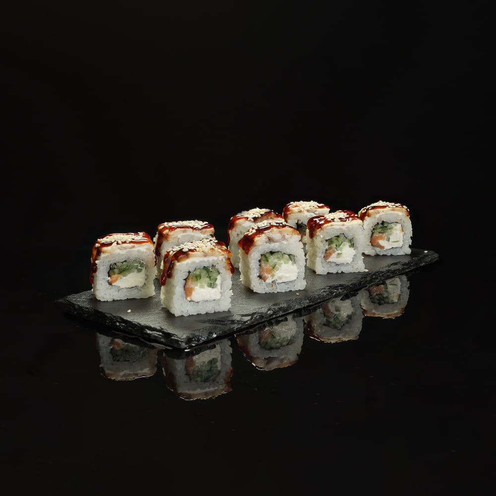 Рис, водоросли нори, сыр творожный, огурец, угорь, лосось, соус унаги, кунжут