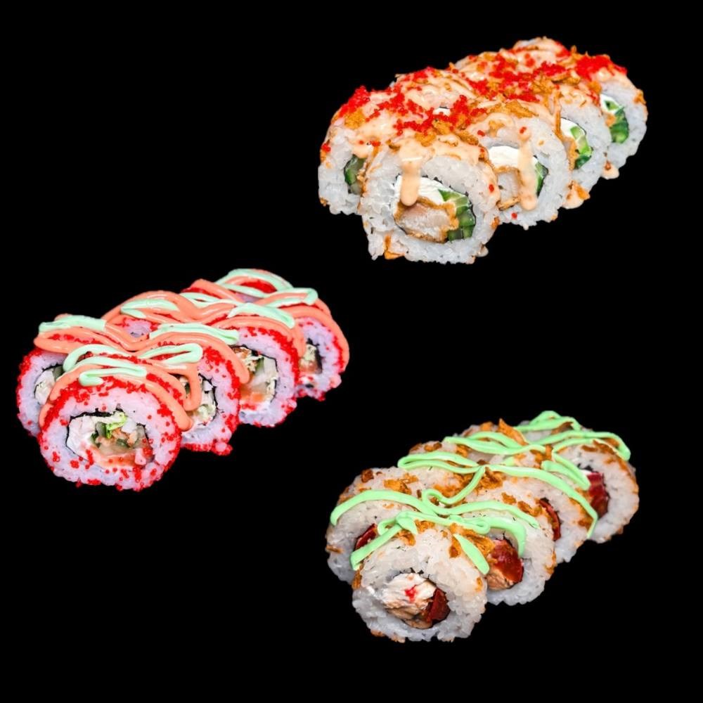 Монако: рис, водоросли нори, сыр творожный, креветка отварная, огурец икра масаго, сырный соус для запекания, соус унаги, соус чили манго
