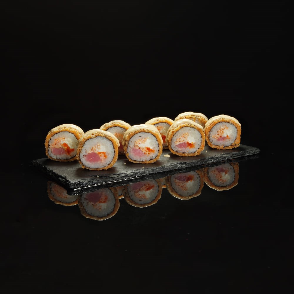 Рис, водоросли нори, сыр творожный, икра масаго, снежный краб, тунец, кляр, сухари панировочные, соус тануки