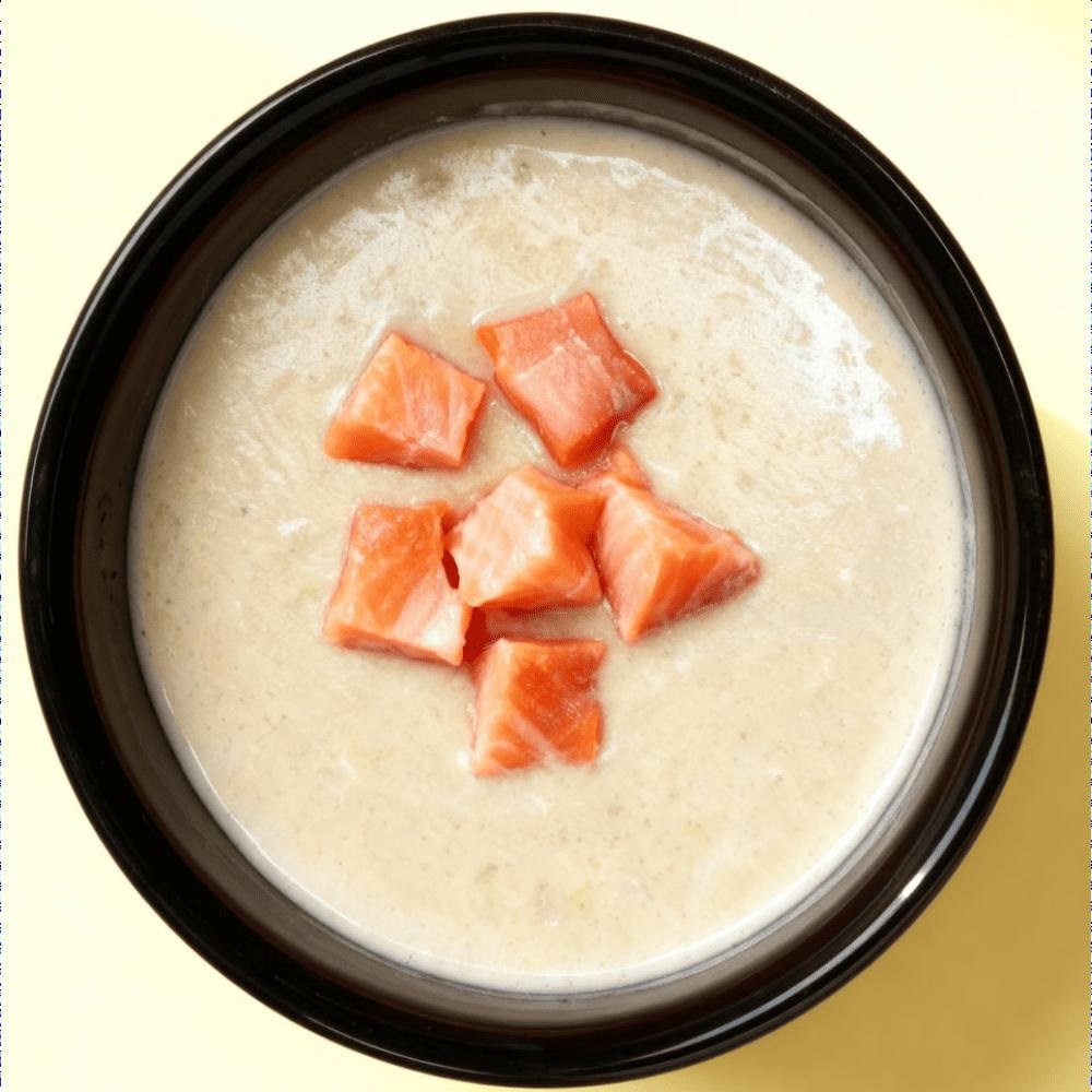 Состав: картофель, кукуруза сладкая, филея лосося, рыбный бульон, молоко, сливки, чиабатта
