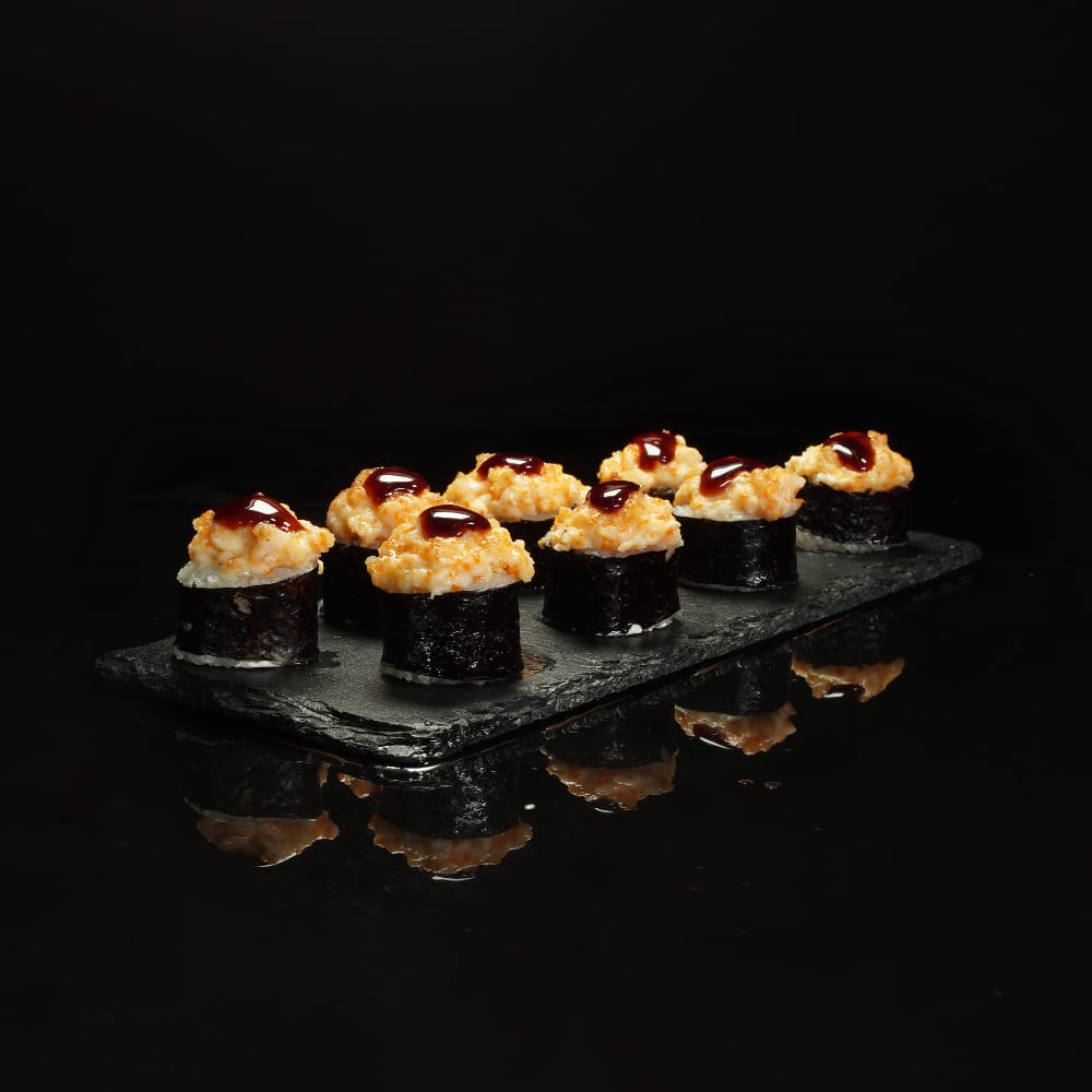 Рис, водоросли нори, сыр творожный, огурец, креветка отварная, сырный соус для запекания, соус унаги
