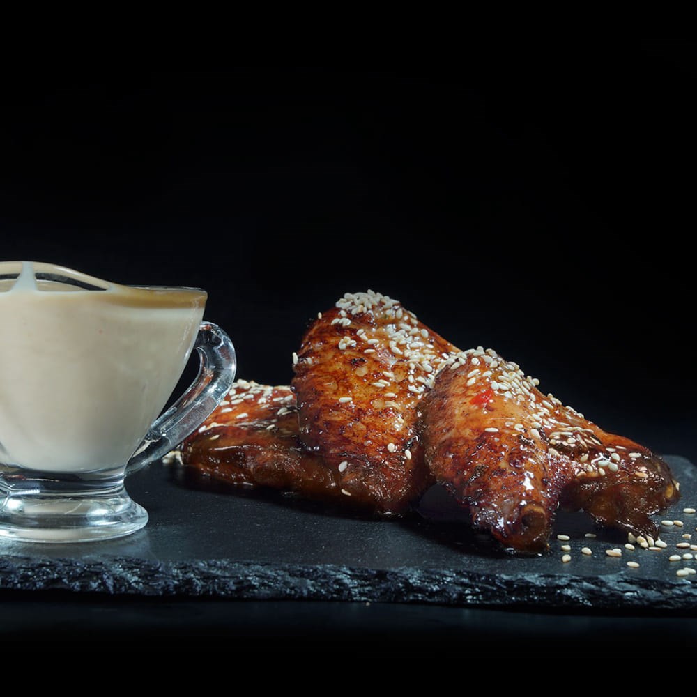 Куриные крылышки су-вид, соус терияки, сладкий чили, чесночное масло с пармезаном, кунжут