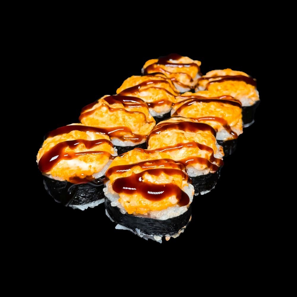 Состав: рис для роллов, нори, окунь в кляре, сыр творожный, помидор, лук зеленый, сырный замес Яки, соус унаги