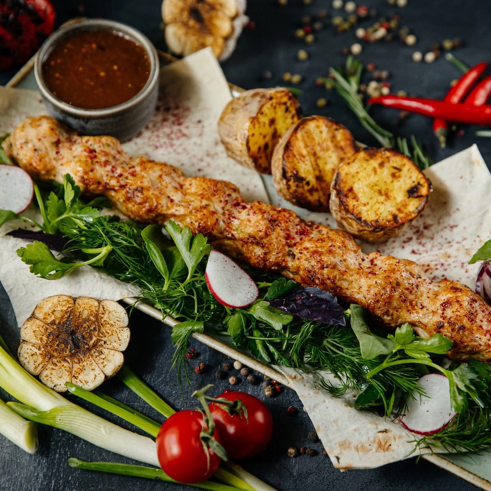 Подается с печеным картофелем, лавашем, маринованным луком, соусом Сацебели