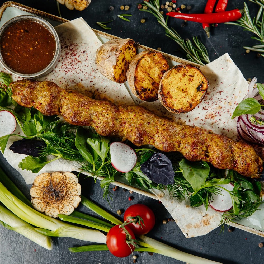 Подается с печеным картофелем, лавашем, маринованным луком, соусом Сацебели