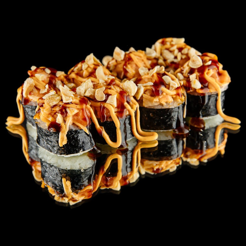 Рис черный, нори, сыр творожный, огурец, краб, лосось, шичими, соус спайси, унаги, арахис