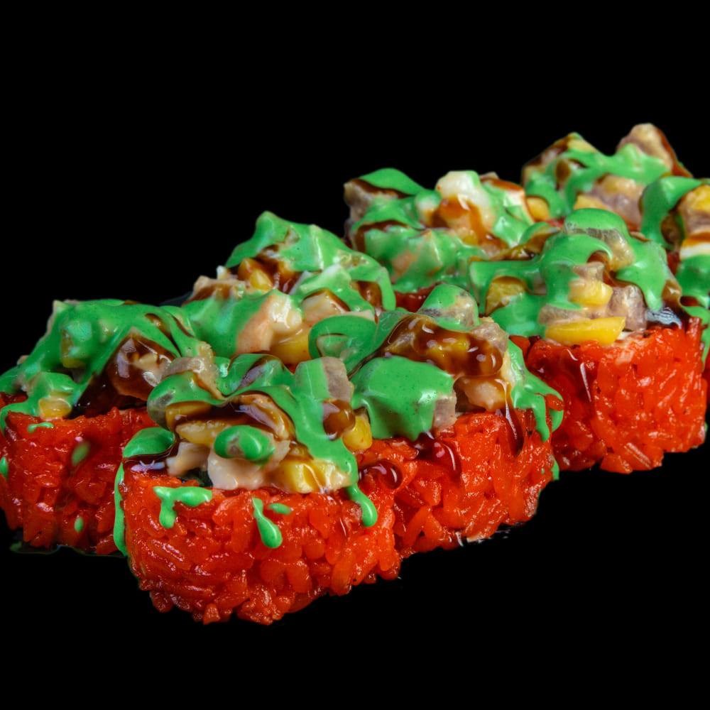 Состав: рис, нори, сыр творожный, огурец, манго, тунец, креветка, соус шичими, соус унаги, соус васаби