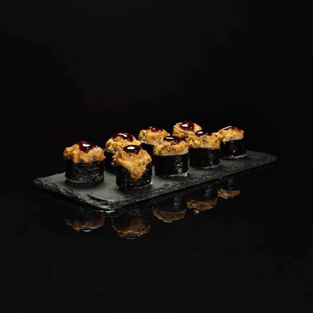 Рис, водоросли нори, сыр творожный, томаты, мясо мидий, сырный соус для запекания, соус унаги
