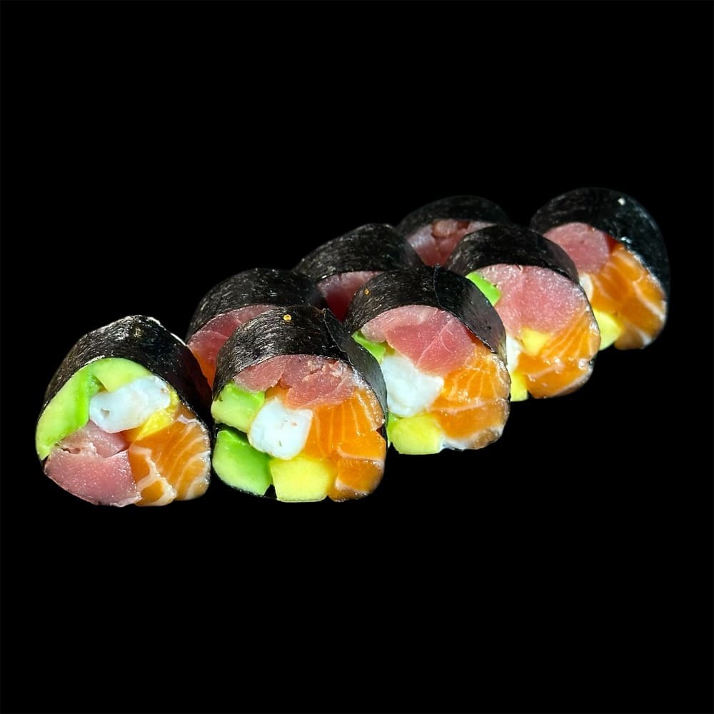 Состав: нори, лосось, тунец, креветка, авокадо, масаго.