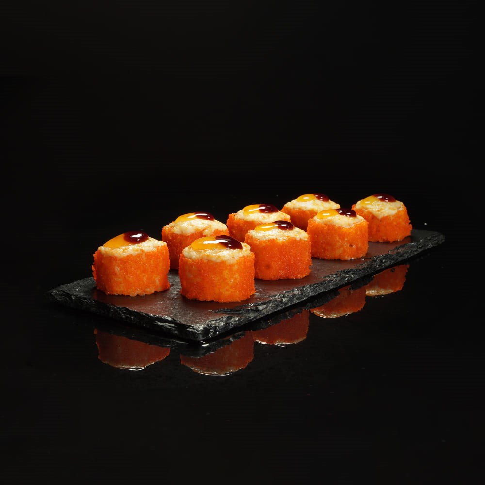 Рис, водоросли нори, сыр творожный, креветка отварная, огурец, икра масаго, сырный соус для запекания, соус унаги, соус чили-манго
