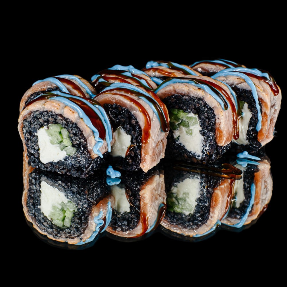 Рис, нори, сыр творожный, огурец, лосось обожжённый, соус Блю-Кюрасао, соус Унаги