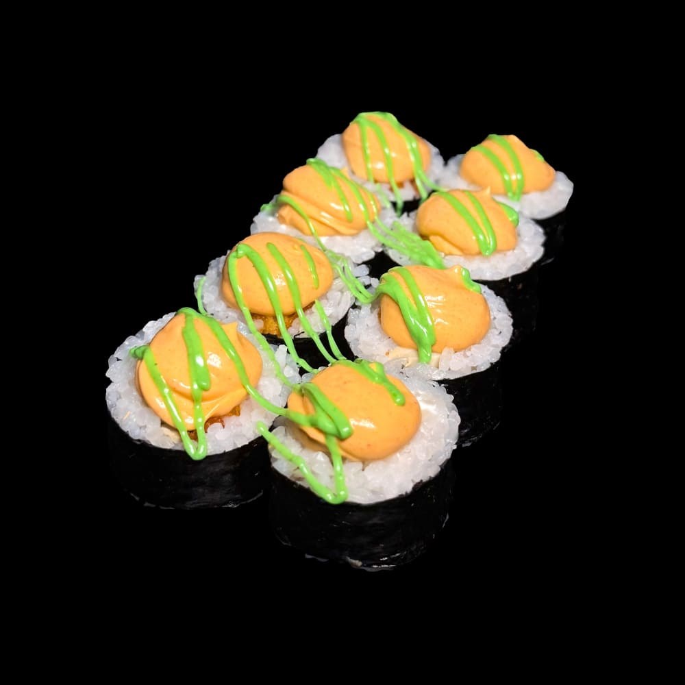 Рис, нори, краб, соус спайси, огурец, лосось лайт, соус унаги