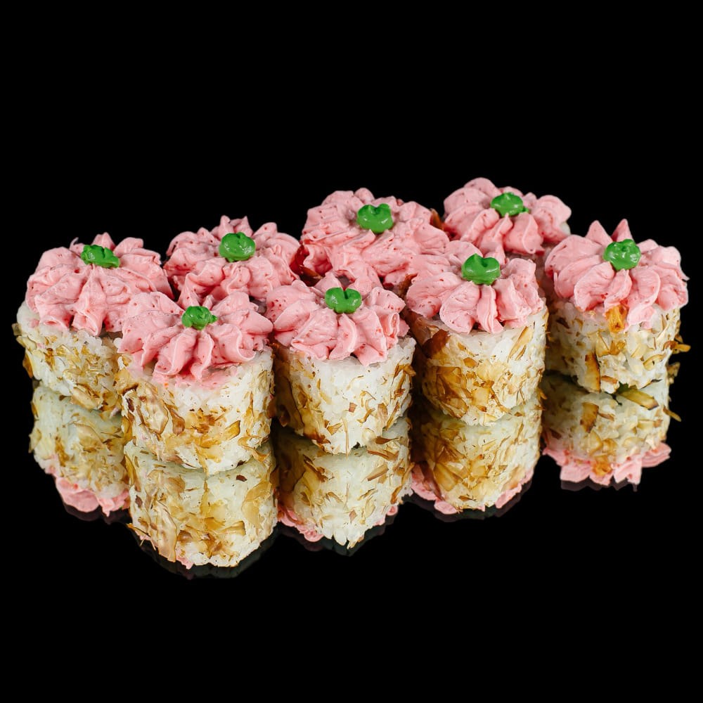 Рис, нори, лосось терияки, лук жаренный, огурец, стружка тунца, сыр с масагой, соус Васаби