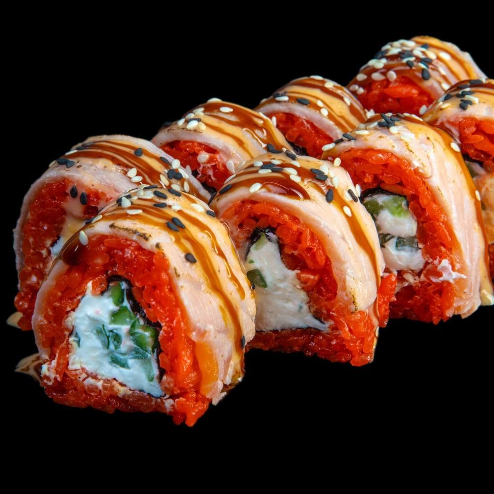 Состав: рис, нори, сыр творожный, огурец, тунец, лосось филе, соус шичими, соус унаги, кунжут белый, кунжут черный
