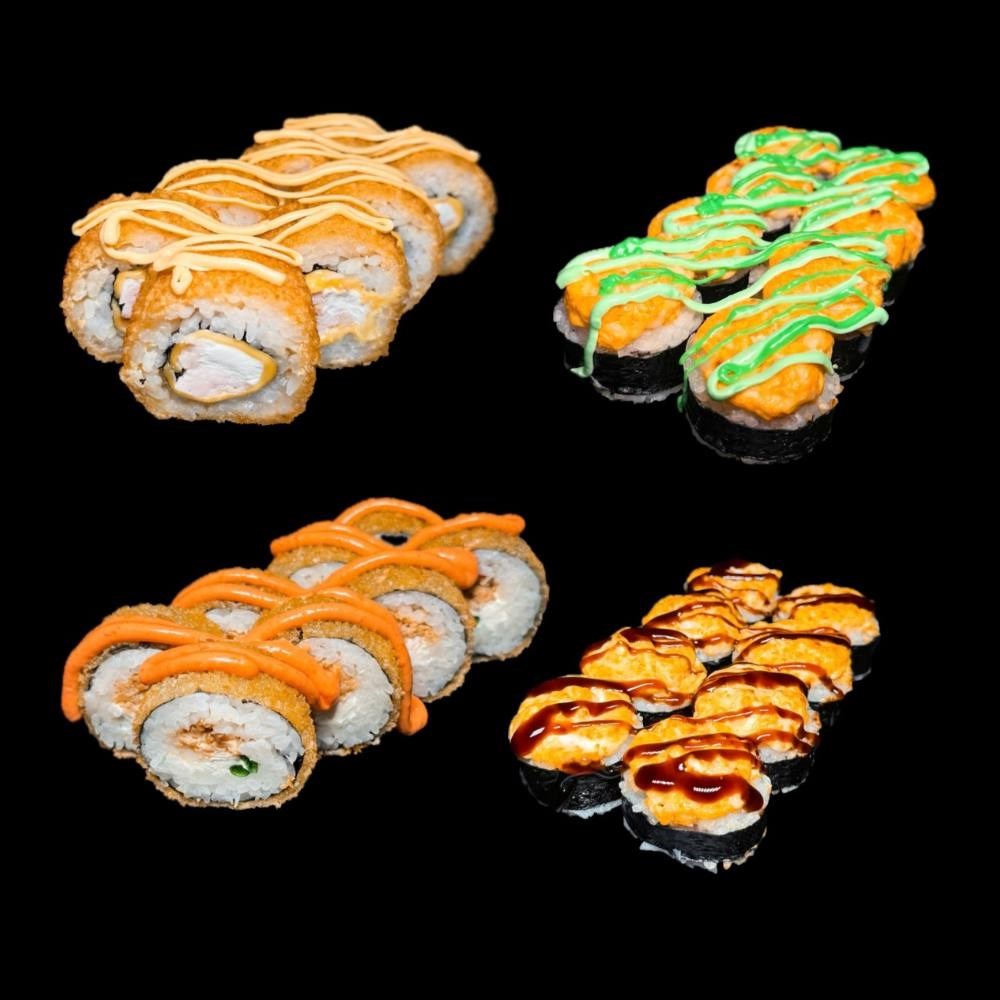 Монако: рис, водоросли нори, сыр творожный, креветка отварная, огурец икра масаго, сырный соус для запекания, соус унаги, соус чили манго