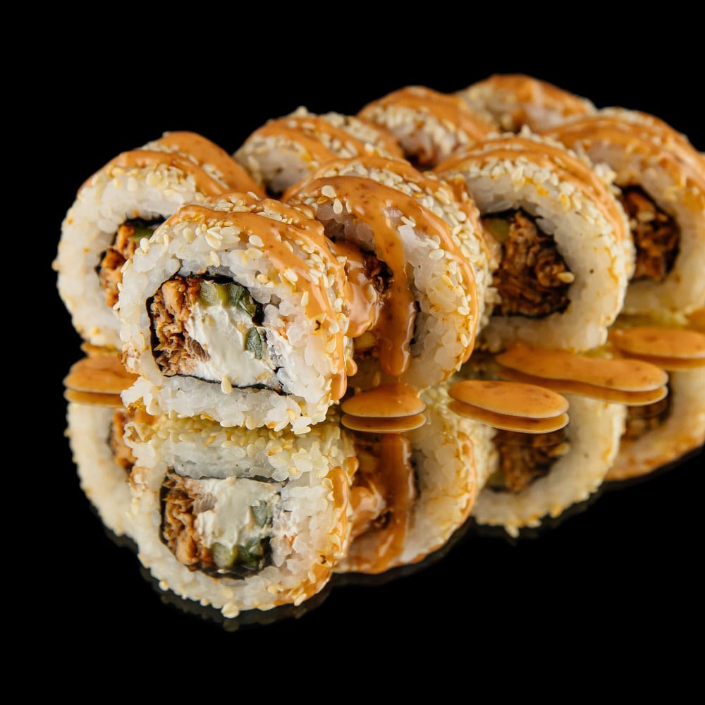 Рис, нори, сыр творожный, лосось терияки, соус кимчи, огурец, кунжут, соус шичими