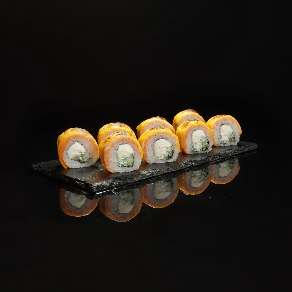 Рис, водоросли нори, сыр творожный, огурец, лосось, сыр чеддер, соус спайси, соус унаги
