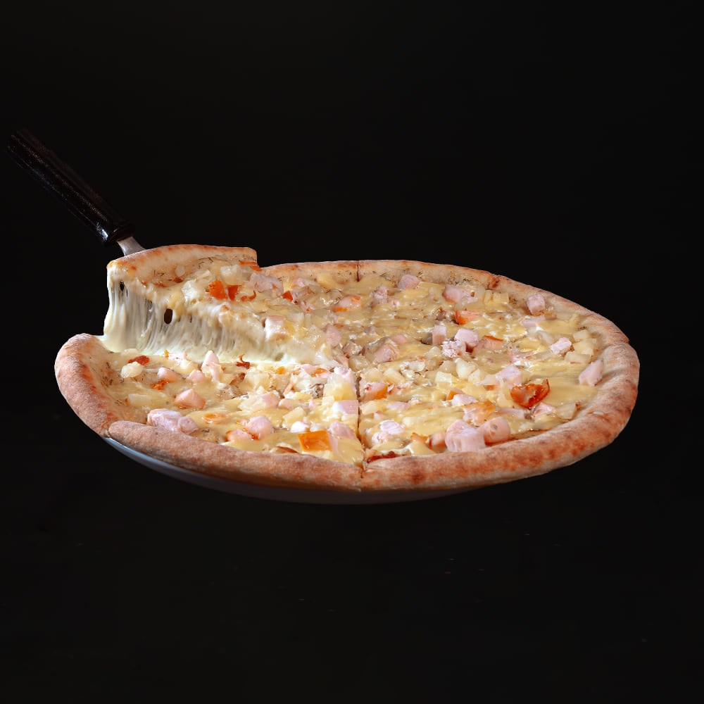Тесто для пиццы, куриная грудка копченая, сыр моцарелла, ананасы, белый соус