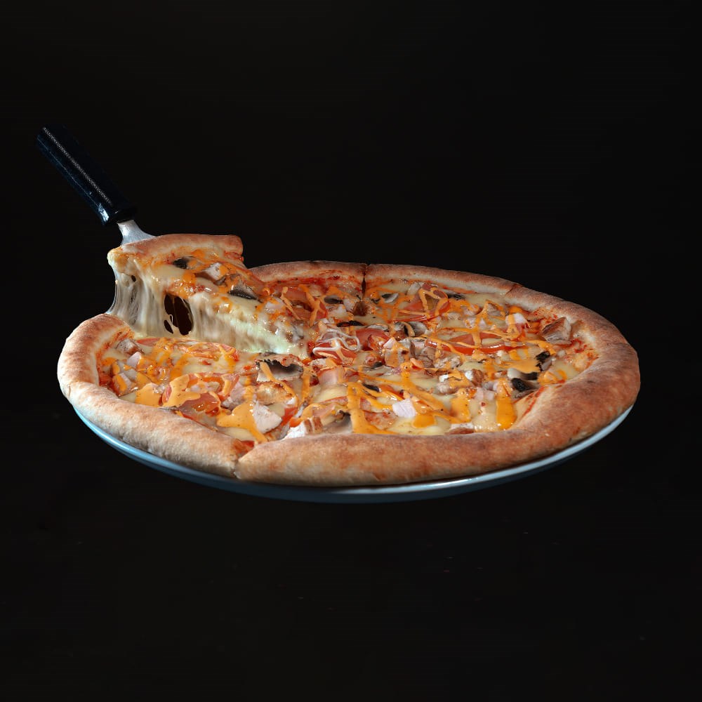 Тесто для пиццы, красный соус, сыр моцарелла, курица жаренная, соус гриль, грибы шампиньоны, помидоры, куриное филе копченое