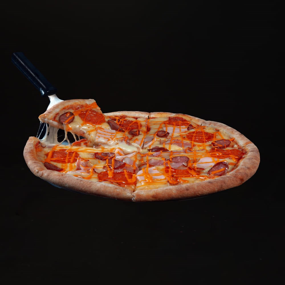 Тесто для пиццы, соус красный, соус 1000 островов, бекон, пепперони, ветчина, колбаски охотничьи, сыр моцарелла