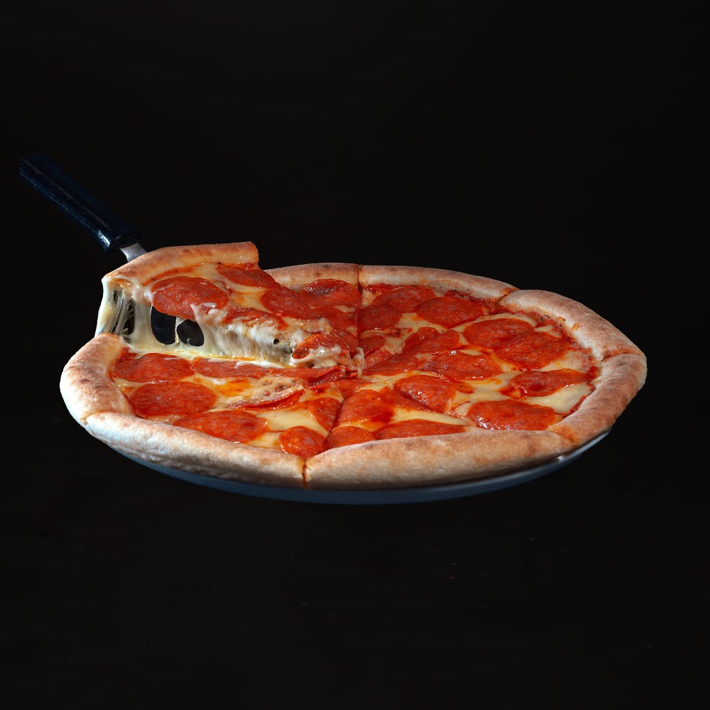 Тесто для пиццы, соус красный, колбаски пепперони, сыр моцарелла