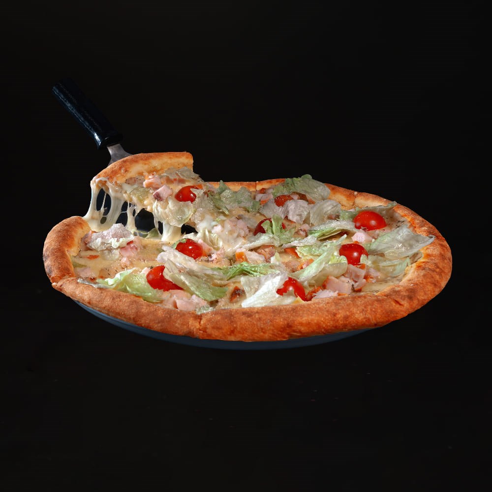 Тесто для пиццы, сыр моцарелла, белый соус, сыр пармезан, помидоры черри, салат айсберг, соус цезарь, курица копченая