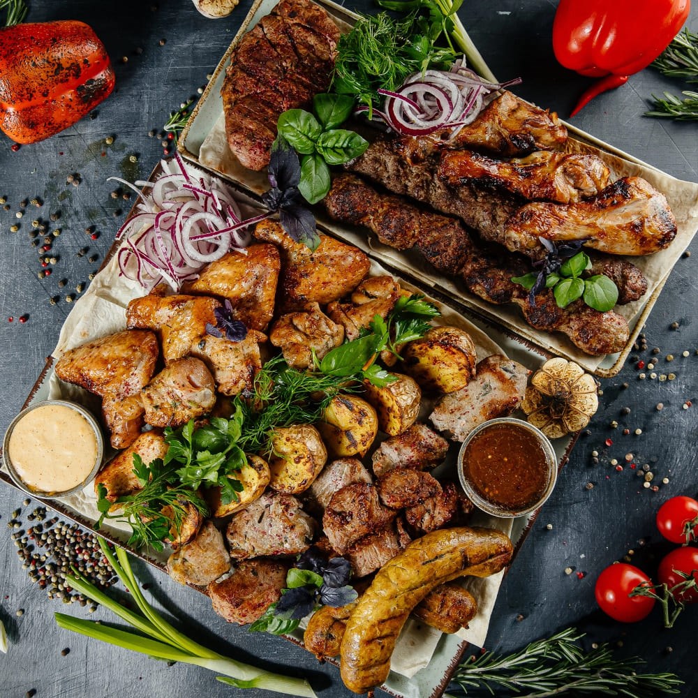 Состав: купаты из индейки, шашлык из свиной шейки, шашлык из свиной вырезки, шашлык из куриного бедра, шашлык из куриных крыльев, стейк из свиной шеи, шашлык из куриных ножек, люля- кебаб из говядины, люля-кебаб из баранины, печеный картофель, соуса, лаваш, маринованный лук