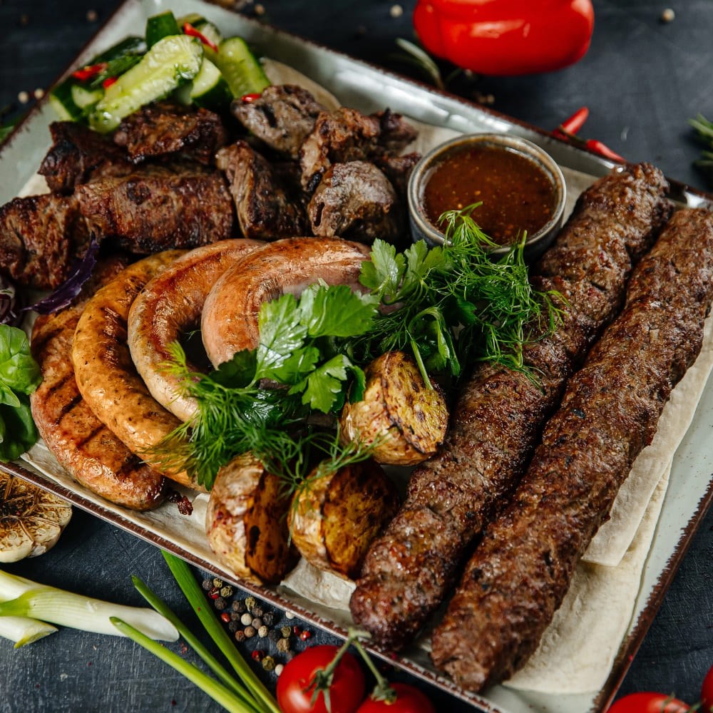 Состав: купаты из индейки, шашлык из свиной шейки, шашлык из свиной вырезки, шашлык из куриного бедра, шашлык из куриных крыльев, стейк из свиной шеи, шашлык из куриных ножек, люля- кебаб из говядины, люля-кебаб из баранины, печеный картофель, соуса, лаваш, маринованный лук